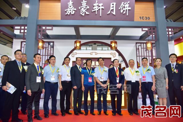 领导嘉宾在参展商嘉豪轩月饼展示区前合影留念。