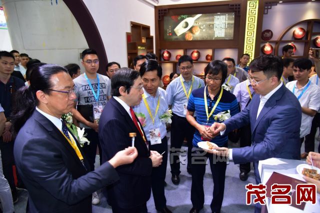 领导嘉宾在参展商嘉豪轩月饼展示区品尝月饼。